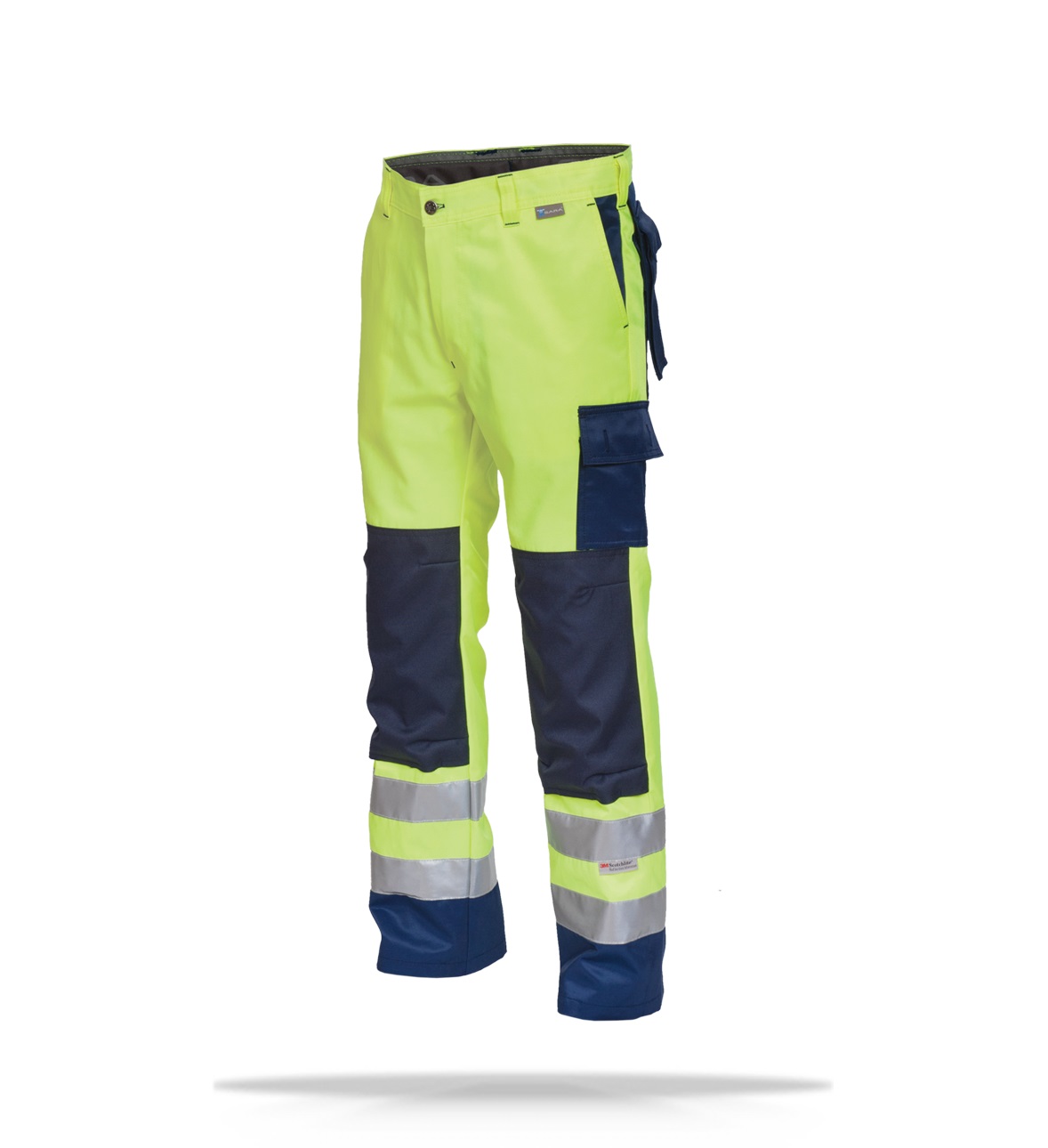 Modern szabású, jól láthatósági derekas nadrág. Fekete térderősítés. Anyagösszetétel: 60 % pamut , 40 % poliészter. Anyagvastagság: 250 g.